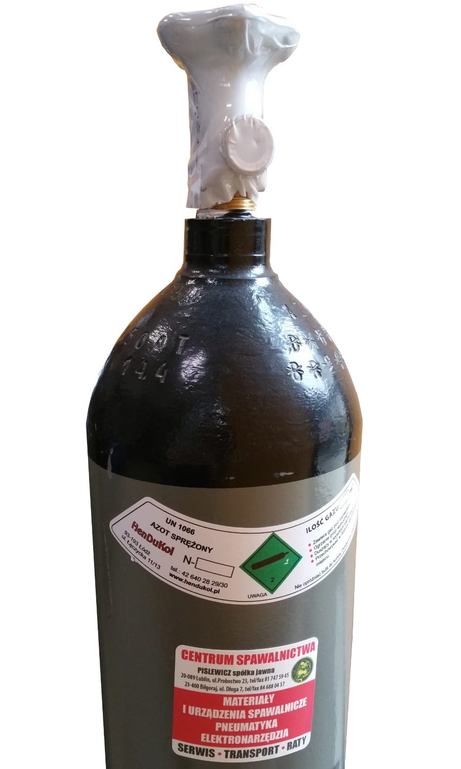 Legalizowana Butla 1,5m3 z gazem AZOTEM, w postaci gazowej azot wykorzystywany jest jako najtańsza z dostępnych atmosfer ochronnych w wielu procesach przemysłowych, a także jako gaz roboczy w niektórych układach pneumatycznych.