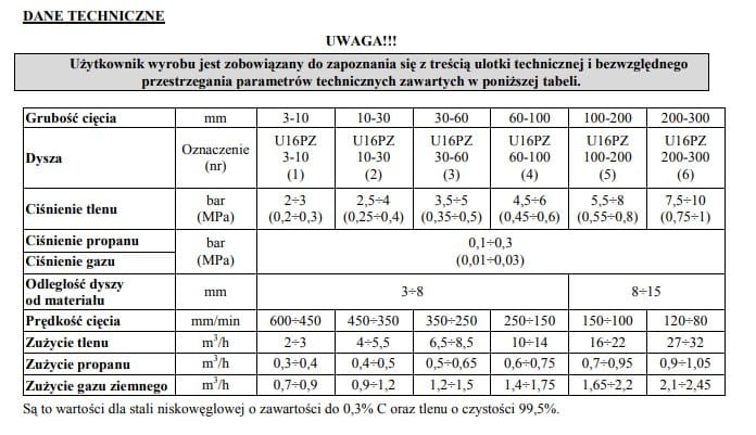 Dysza tnąca U16PZ 30-60mm do cięcia gazowego PC216PZ