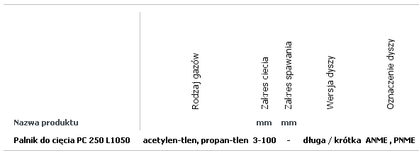 Palnik do cięcia gazowego PC 250 L=100. Palnik bezinżektorowy do cięcia gazami tlen+acetylen lub tlen+propan w zależności od zastosowanej dyszy. Służy do cięcia tlenem konstrukcyjnych stali węglowych i niskostopowych oraz złomu. Umożliwia również wykonywanie prac pokrewnych takich jak podgrzewanie, opalanie itp.