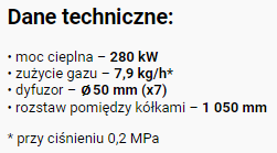 - Zużycie gazu: 7,9 kg/h (przy ciśnieniu 0,4MPa)