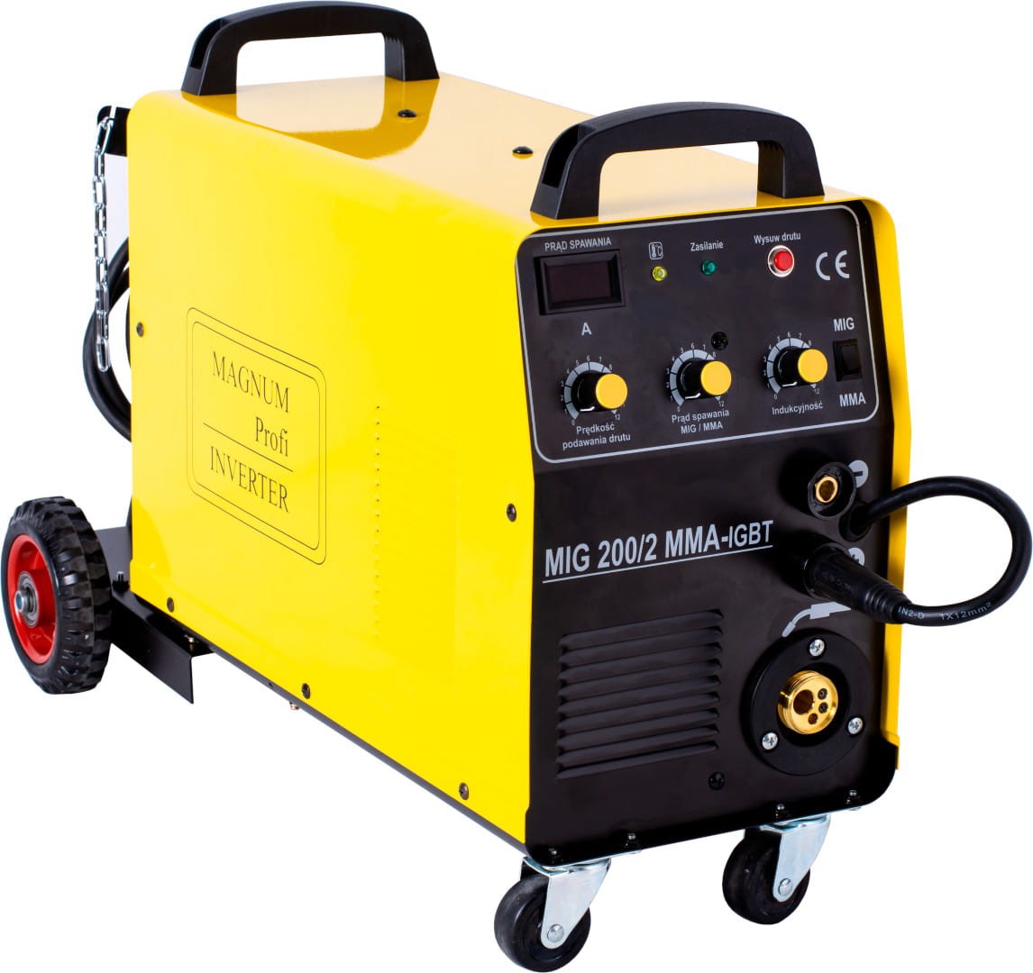 Urządzenie marki MAGNUM MIG 200/2 MMA KN jest półautomatem spawalniczym wykonanym w technologii inwerterowej, może być zasilane zarówno z sieci 230 V, jak i 400 V. Urządzenie umożliwia spawanie łukowe drutem topliwym MIG/MAG, drutem samoosłonowym FCAW (należy zmienić biegunowość w spawarce: minus (-) na uchwycie spawalniczym, plus (+) na masie!), oraz elektrodą otuloną MMA. Przeznaczone jest do wszelkiego rodzaju prac spawalniczych w warsztatach ślusarskich, warsztatach naprawczych.