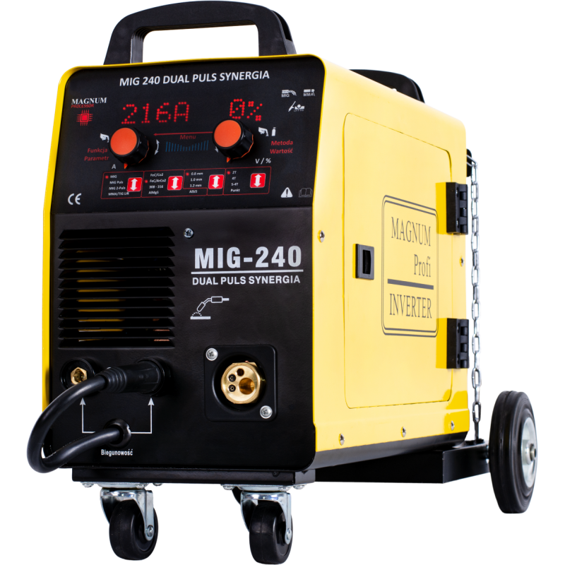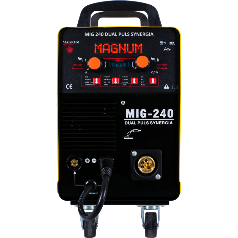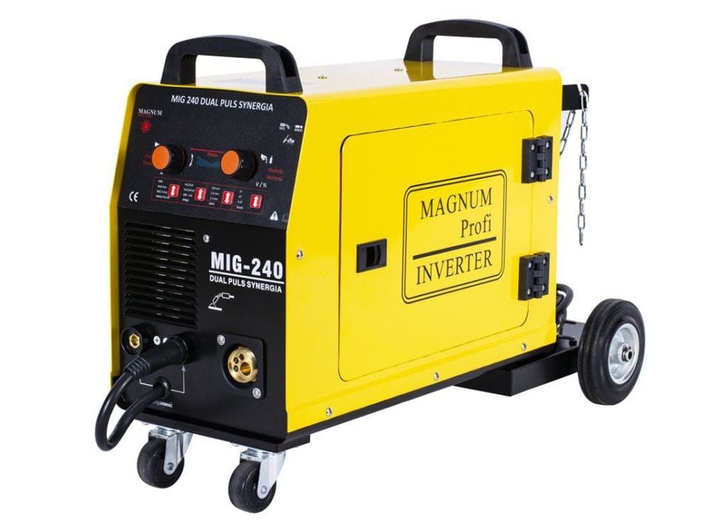 MIG 240 Dual Puls Synergia marki MAGNUM to zaawansowane technologicznie urządzenie spawalnicze, do spawania metodą MIG-MAG, MMA i TIG LIFT (w tym TIG LIFT z pulsem). Przeznaczone do ręcznego, elektrycznego spawania stali niskowęglowych, niskostopowych, stali wysoko stopowych, nierdzewnych i kwasoodpornych, aluminium i jego stopów itp.