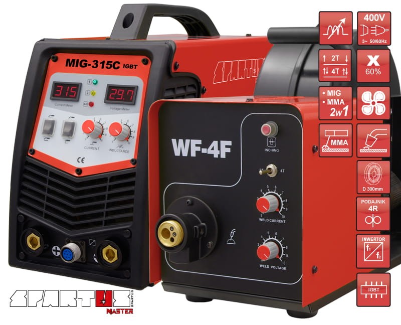SPARTUS MasterMIG315C to nowoczesny półautomat spawalniczy z wydzielonym podajnikiem drutu.