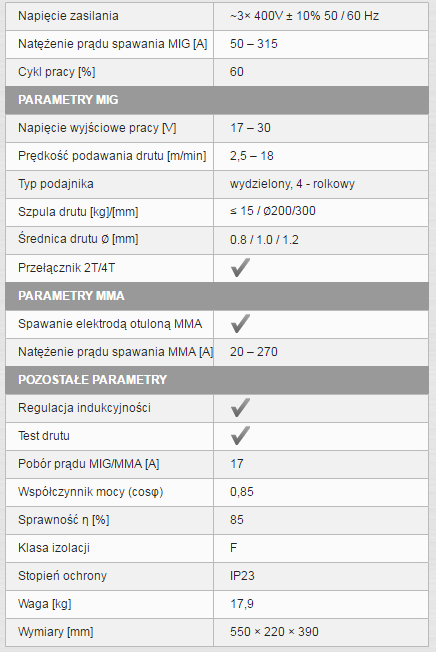 Źródło spawania wykonane jest w technologii inwertorowej z wykorzystaniem tranzystorów IGBT. Umożliwia spawanie elektrodą topliwą w osłonie gazów obojętnych i aktywnych (MIG/MAG – maks. prąd spawania 315A) oraz elektrodą otuloną (MMA – maks. prąd spawania 270A). Urządzenie zasilane jest z sieci trójfazowej 400V.