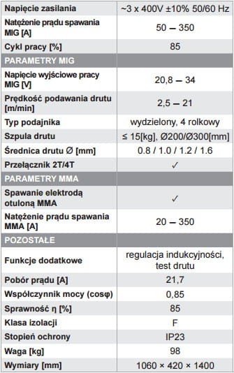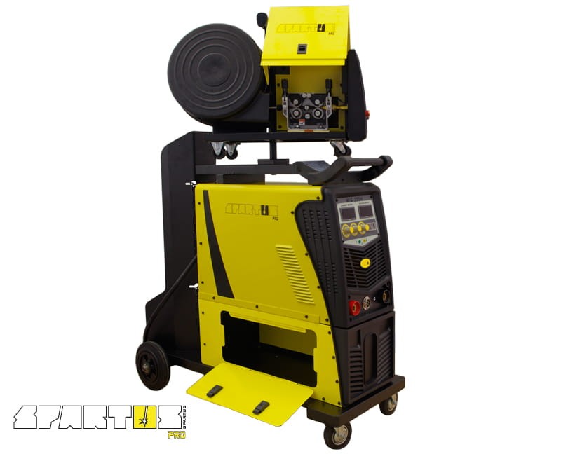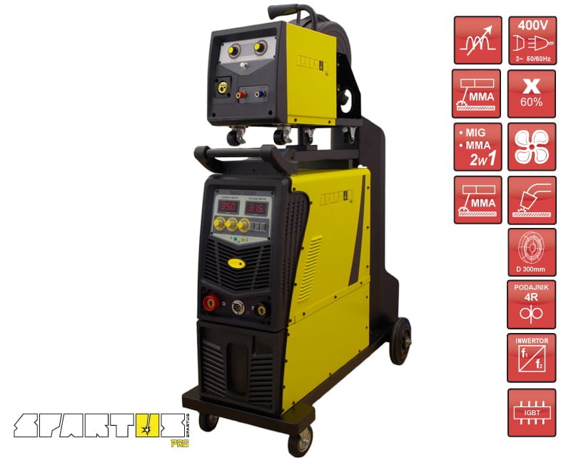 Półautomat spawalniczy Spartus PRO MIG 350H typu Tower z wydzielonym podajnikiem drutu. Wykonany w technologii inwertorowej z wykorzystaniem najwyższej jakości podzespołów. Umożliwia spawanie metodami MIG/MAG oraz MMA. Maksymalny prąd spawania dla obydwu metod wynosi 350A. Urządzenie zasilane jest z sieci trójfazowej 400V.