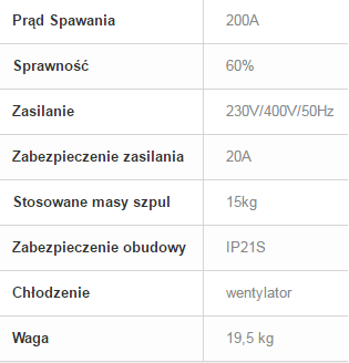 Półautomat posiada płynną regulację napięcia spawania (30-200A) oraz wyposażone jest w przeciążeniowy układ zabezpieczenia termicznego, zapobiegający przed nadmiernym nagrzewaniem się urządzenia. Półautomat posiada 2 rolkowy układ podający drutu oraz eurogniazdo uchwytu spawalniczego. Umożliwia spawanie stalowymi drutami spawalniczymi o średnicy 0,6 - 1,0 mm na szpulach 5kg i 15 kg.