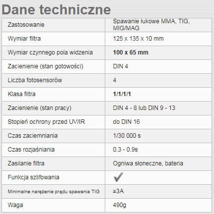 Wbudowane 4 nowoczesne fotosensory gwarantują najwyższą czułość filtra. Minimalny prąd spawania dla metody TIG wynosi 3A. Filtr posiada regulację: stopnia zaciemnienia, czasu rozjaśniania, czułości oraz funkcję TEST.