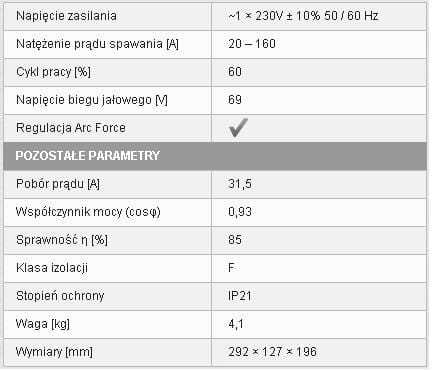 Prąd spawania mieści się w zakresie 10 – 160A. Posiada moc niezbędną do spawania elektrodami o średnicy do 3,2mm. Spawarka wyposażona jest w pokrętła regulacji natężenia prądu spawania i wartości funkcji Arc Force. Wbudowany cyfrowy wyświetlacz umożliwia precyzyjną kontrolę parametrów spawania.