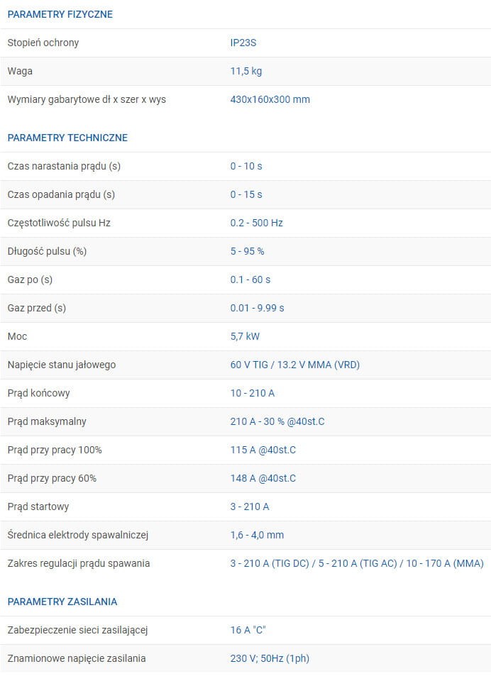 - tryb TIG: ciągły, punktowy, 2-level