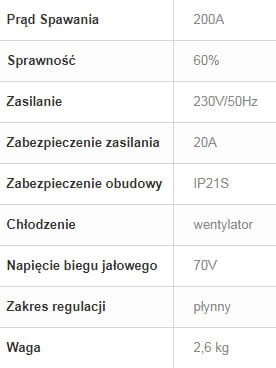- max. prąd spaw.: 200A/60%