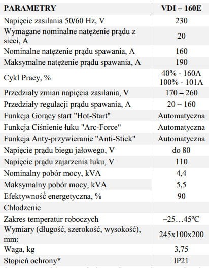Spawarka inwertorowa VDI 160E DC MMA do spawania metodą MMA elektrodą otuloną prądem stałym (DC). Zasilanie 230V, prąd spawania 160A. Urządzenie objęte jest 5-letnią gwarancją producenta!