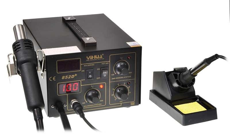 Stacja lutownicza Yihua 852D+ została wyposażona w mocny element grzejny gwarantujący szybkie nagrzewanie oraz trwałość grzałki. Posiada płynną regulacje nawiewu oraz temperatury. Stacja została zaprojektowana do prac lutowniczych z takimi komponentami jak układy SOIC, QFP, PLCC, BGA, SMD..... Jak również nagrzewaniem, wygrzewaniem koszulek termokurczliwych, rozmrażaniem, rozpuszczaniem klejów, opalaniem farb, podgrzewaniem....