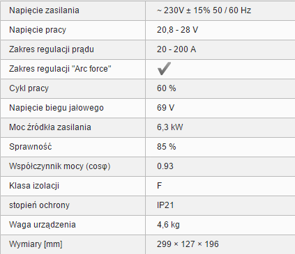 ARC 210E służy do spawania metodą MMA elektrodami otulonymi w zakresie 20 - 200A. Przy prądzie 200A pracuje w cyklu 60%. ARC 200E wyposażono w wyświetlacz cyfrowy oraz regulację ARC FORCE. Małe i poręczne urządzenie linii SPARTUS Easy w zestawie zawiera walizkę, uchwyt elektrodowy i masowy, tarczę spawalniczą, młotek ze szczotką oraz pasek umożliwiający noszenie spawarki na ramieniu.