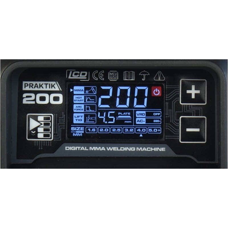 PRAKTIK 200 LCD SYNERGY jest spawarką inwertorową do spawania metodą MMA elektrodą otuloną prądem stałym (DC) oraz metodą TIG prądem stałym (DC) ze zwarciowym zajarzeniem łuku. Umożliwia spawanie elektrodami rutylowymi, zasadowymi, do stali nierdzewnej i żeliwa. Sterowana synergicznie, płynna regulacja prądu spawania. Niewielkie rozmiary i waga sprawiają, że urządzenie doskonale sprawdza się zarówno w pracach warsztatowych jak i podczas prac terenowych.