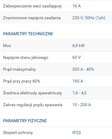 HOT START: gorący start - ułatwia zapłon elektrody poprzez dostarczenie większego prądu spawania przy każdym zajarzeniu łuku. Maksymalna średnica elektrody otulonej 4,0. Chłodzona wentylatorem. Zabezpieczenie przeciw przeciążeniu. Cena urządzenia z akcesoriami:przewodem spawalniczym 1,5m, przewodem masowym 1,5m, paskiem na ramię.